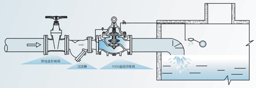 口向水池注水,實現(xiàn)自動補(bǔ)水.液位控制精度準(zhǔn)確,不受水壓干擾;100X隔膜式遙控浮球閥可隨水池的高度及使用